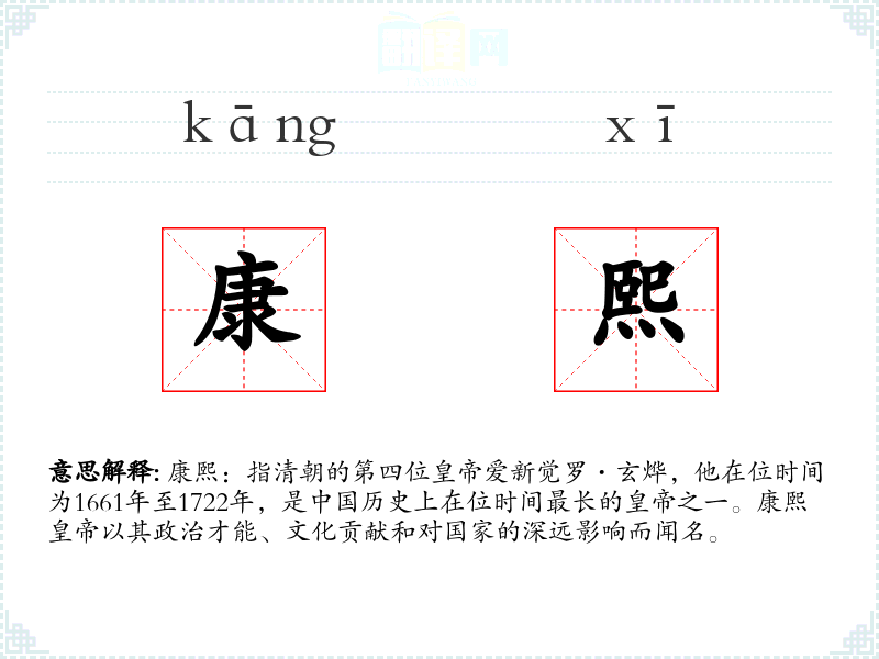 康熙:指清朝的第四位爱新觉罗·玄烨,他在位时间为11年至1722年,是历史上在位时间最长的之一。康熙**以其政治才能、文化贡献和对国家的深远影响而闻名。