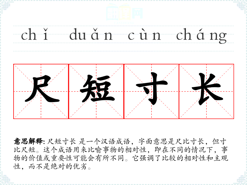 尺短寸长 是一个汉语成语,字面意思是尺比寸长,但寸比尺短。这个成语用来比喻事物的相对性,即在不同的情况下,事物的价值或重要性可能会有所不同。它强调了比较的相对性和主观性,而不是绝对的优劣。