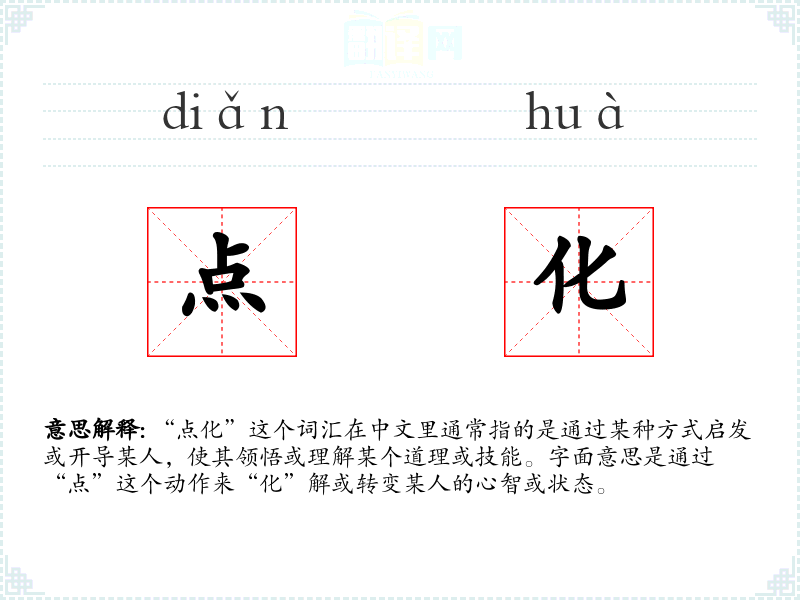 “点化”这个词汇在中文里通常指的是通过某种方式启发或开导某人,使其领悟或理解某个道理或技能。字面意思是通过“点”这个动作来“化”解或转变某人的心智或状态。