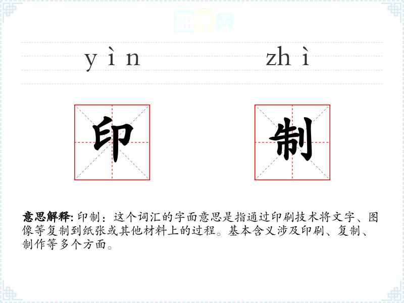 印制:这个词汇的字面意思是指通过印刷技术将文字、图像等复制到纸张或其他材料上的过程。基本含义涉及印刷、复制、制作等多个方面。
