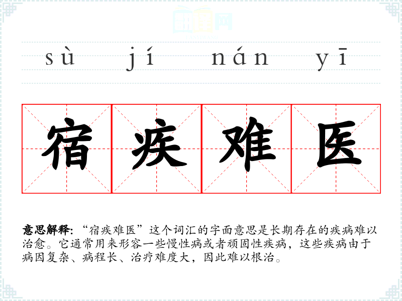 “宿疾”一词中的“宿”字意为长期、久远,“疾”字意为疾病。这个词汇在古代汉语中就已经存在,用来形容长期存在的疾病。随着时间的推移,这个词组的使用范围逐渐扩大,不仅用于医学领域,也用于比喻长期存在的问题或困境。