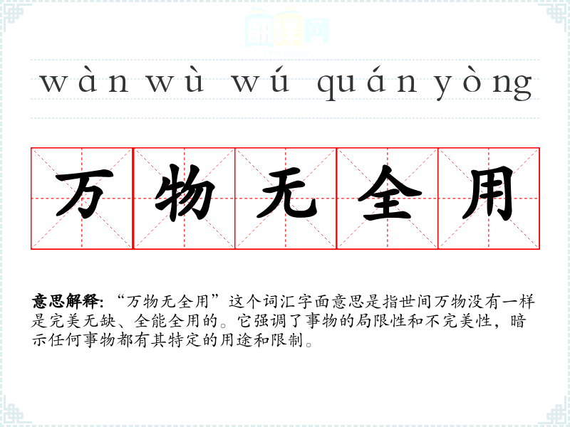 “万物无全用”这个词汇字面意思是指世间万物没有一样是完美无缺、全能全用的。它强调了事物的局限性和不完美性,暗示任何事物都有其特定的用途和限制。