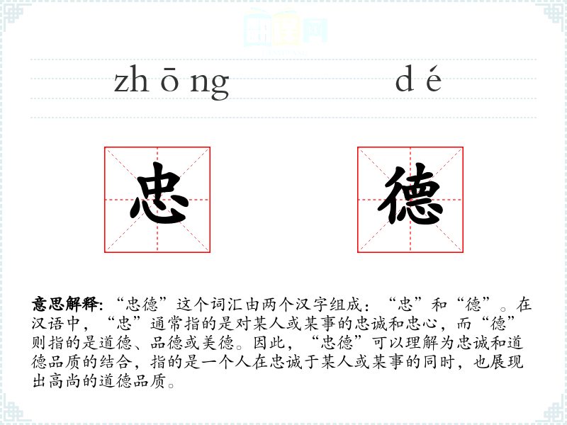 “忠德”这个词汇由两个汉字组成:“忠”和“德”。在汉语中,“忠”通常指的是对某人或某事的忠诚和忠心,而“德”则指的是道德、品德或美德。因此,“忠德”可以理解为忠诚和道德品质的结合,指的是一个人在忠诚于某人或某事的同时,也展现出高尚的道德品质。