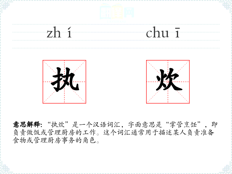 在英语中,与“执炊”相对应的词汇可能是“cook”或“chef”,但这些词汇更侧重于描述烹饪的动作或职业,而不像“执炊”那样带有家庭和情感的色彩。