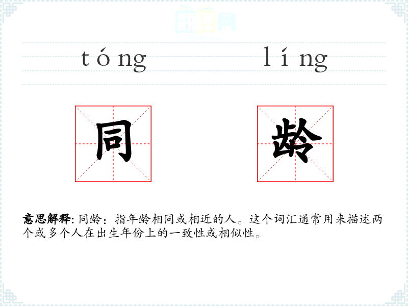 同龄:指年龄相同或相近的人。这个词汇通常用来描述两个或多个人在出生年份上的一致性或相似性。
