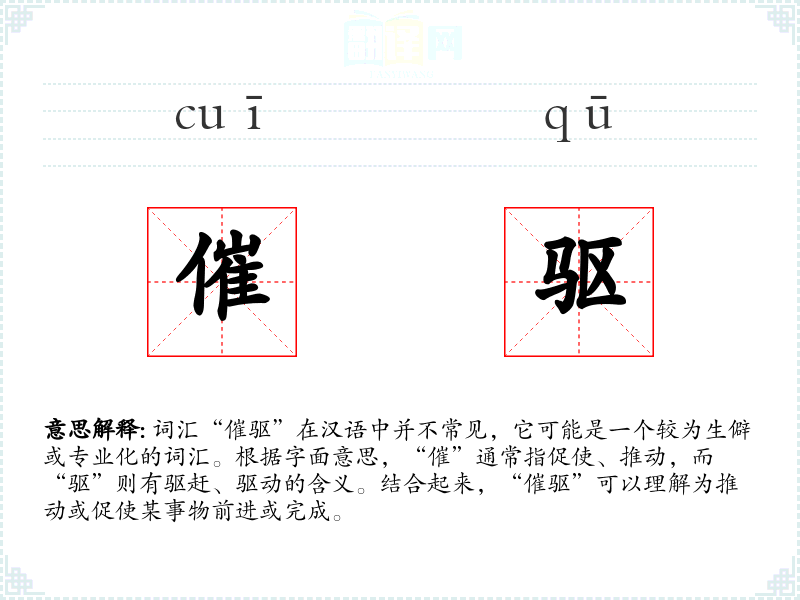 词汇“催驱”在汉语中并不常见,它可能是一个较为生僻或专业化的词汇。根据字面意思,“催”通常指促使、推动,而“驱”则有驱赶、驱动的含义。结合起来,“催驱”可以理解为推动或促使某事物前进或完成。