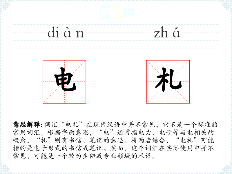 - 理解:“电札”是一个结合了电子和书信概念的词汇,虽然在现代汉语中不常见,但在描述电子通信方式时具有一定的科技感。