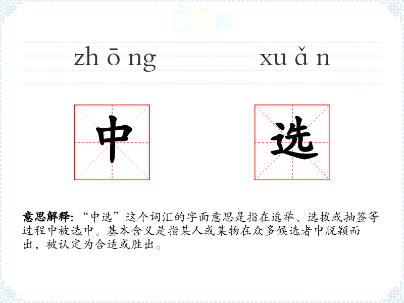 “中选”这个词汇的字面意思是指在选举、选拔或抽签等过程中被选中。基本含义是指某人或某物在众多候选者中脱颖而出,被认定为合适或胜出。