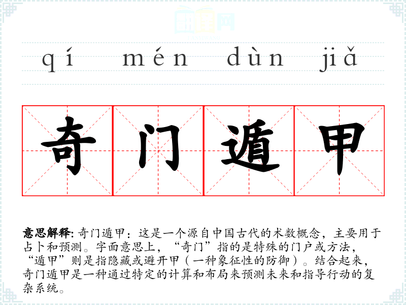 奇门遁甲:这是一个源自中国古代的术数概念,主要用于占卜和预测。字面意思上,“奇门”指的是特殊的门户或方法,“遁甲”则是指隐藏或避开甲(一种象征性的防御)。结合起来,奇门遁甲是一种通过特定的计算和布局来预测未来和指导行动的复杂系统。