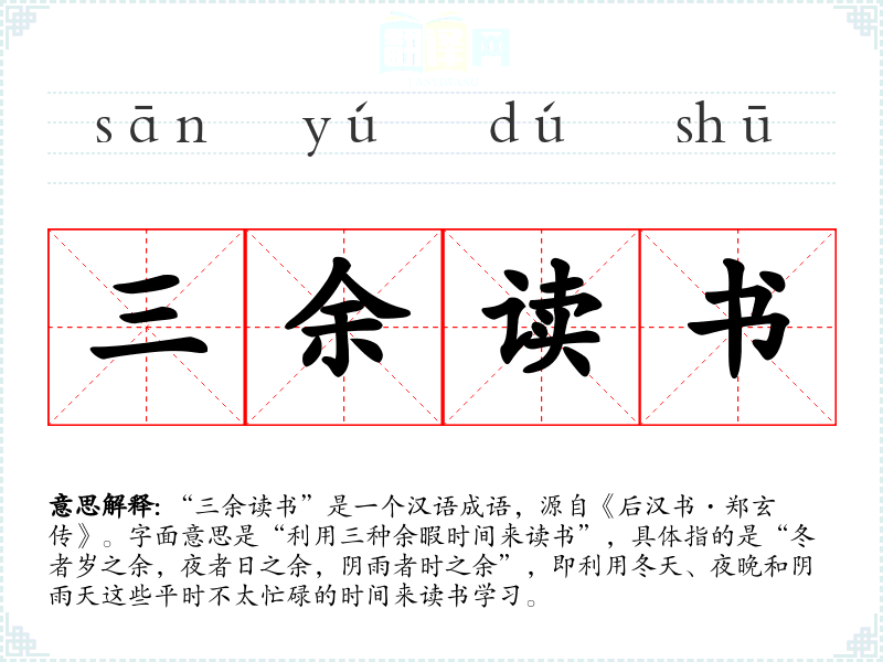 “三余读书”这个成语最早出现在《后汉书》中,描述的是郑玄的学态度。随着时间的推移,这个成语被广泛用于鼓励人们珍惜时间,勤奋学。