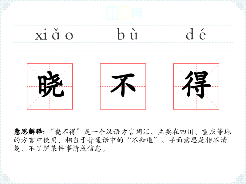 “晓不得”是一个汉语方言词汇,主要在四川、重庆等地的方言中使用,相当于普通话中的“不知道”。字面意思是指不清楚、不了解某件事情或信息。