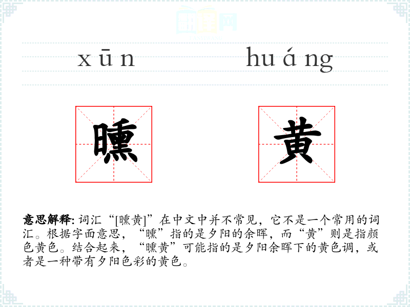 - 词源:“曛”字源自古代汉语,意为夕阳的余晖;“黄”字则是基本颜色词。