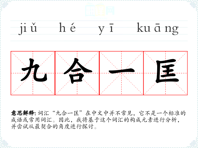 “九合一匡”字面意思可能是指九个事物合并成一个,并且这个合并的事物具有纠正或匡正的作用。然而,由于这不是一个标准词汇,其确切含义可能需要具体的语境来确定。