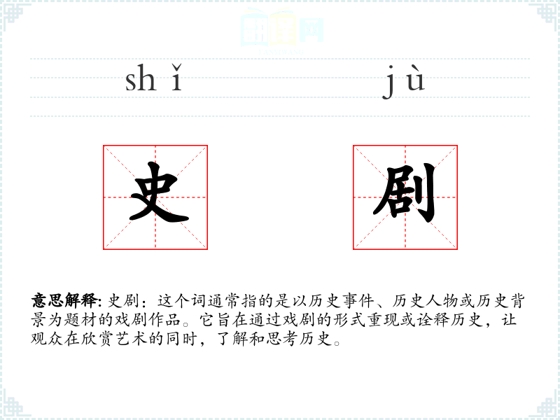 - 专业领域:在戏剧学、历史学等领域,史剧的研究可能涉及剧本分析、历史真实性与艺术虚构的平衡等。