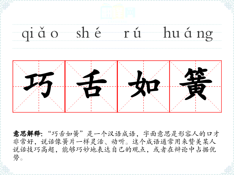 “巧舌如簧”是一个汉语成语,字面意思是形容人的口才非常好,说话像簧片一样灵活、动听。这个成语通常用来赞美某人说话技巧高超,能够巧妙地表达自己的观点,或者在辩论中占据优势。