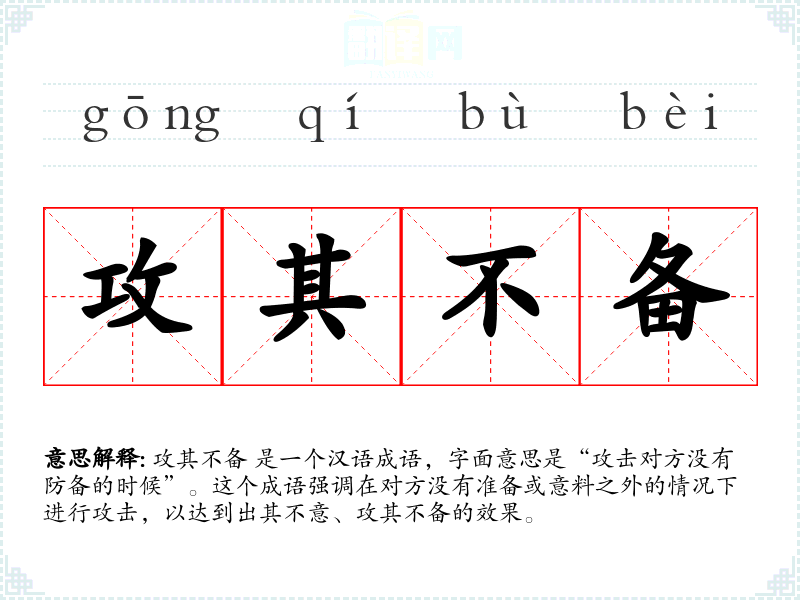 攻其不备 是一个汉语成语,字面意思是“攻击对方没有防备的时候”。这个成语强调在对方没有准备或意料之外的情况下进行攻击,以达到出其不意、攻其不备的效果。