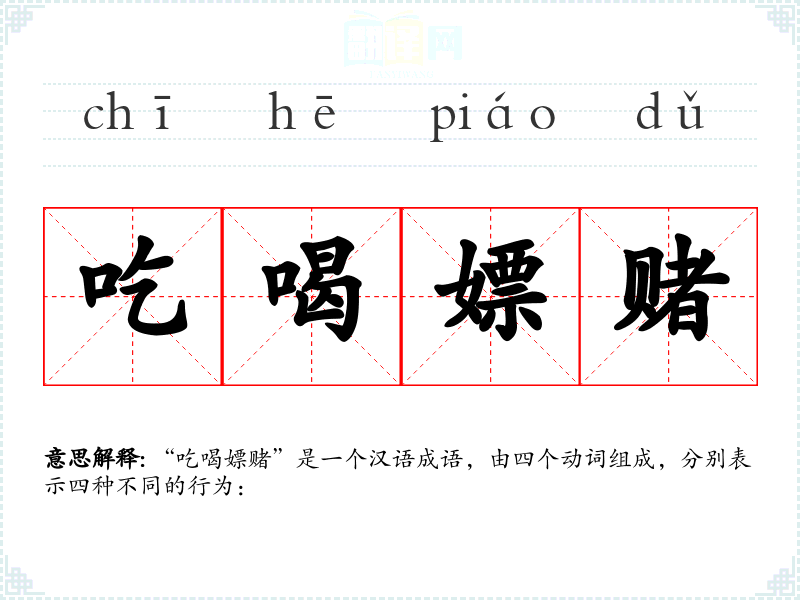 “吃喝嫖赌”是一个汉语成语,由四个动词组成,分别表示四种不同的行为: