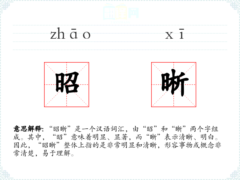 “昭晰”是一个汉语词汇,由“昭”和“晰”两个字组成。其中,“昭”意味着明显、显著,而“晰”表示清晰、明白。因此,“昭晰”整体上指的是非常明显和清晰,形容事物或概念非常清楚,易于理解。