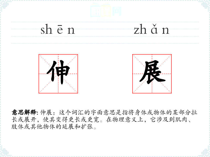 伸展:这个词汇的字面意思是指将身体或物体的某部分拉长或展开,使其变得更长或更宽。在物理意义上,它涉及到肌肉、肢体或其他物体的延展和扩张。