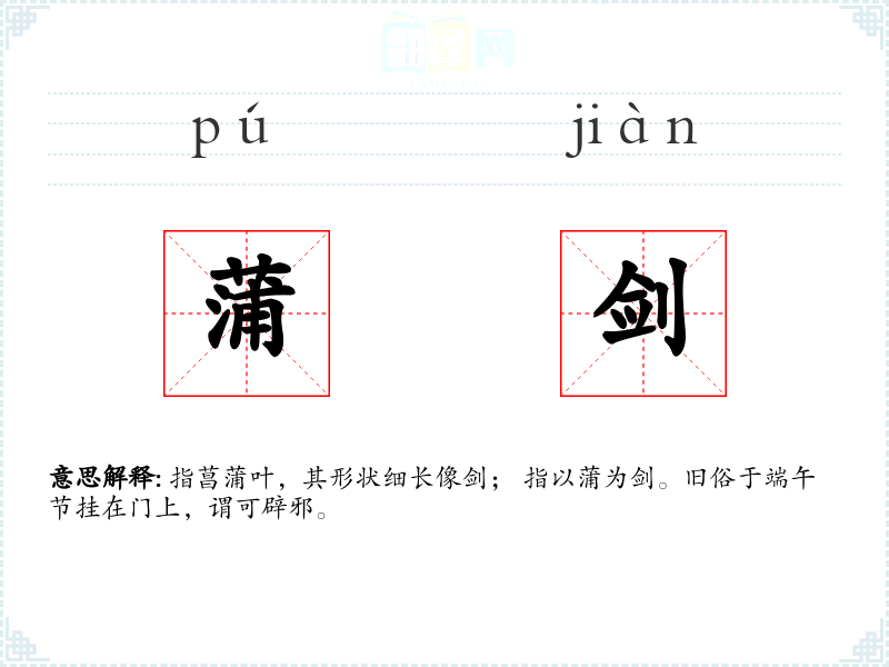 指菖蒲叶,其形状细长像剑; 指以蒲为剑。旧俗于端午节挂在门上,谓可辟邪。