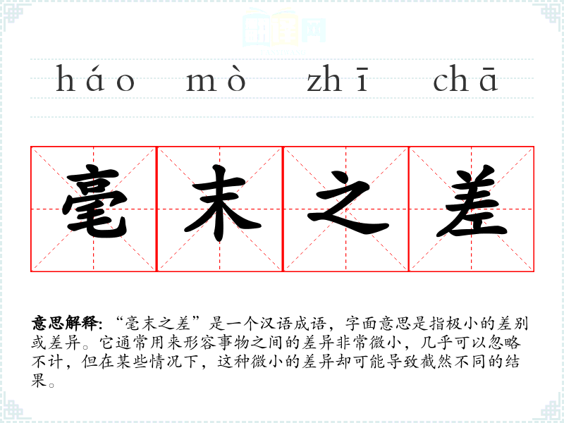“毫末之差”是一个汉语成语,字面意思是指极小的差别或差异。它通常用来形容事物之间的差异非常微小,几乎可以忽略不计,但在某些情况下,这种微小的差异却可能导致截然不同的结果。