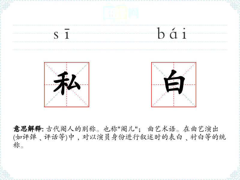 古代阉人的别称。也称"阉儿"; 曲艺术语。在曲艺演出(如评弹﹑评话等)中﹐对以演员身份进行叙述时的表白﹑衬白等的统称。