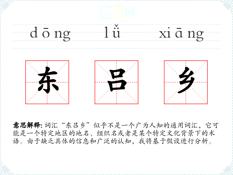 词汇“东吕乡”似乎不是一个广为人知的通用词汇,它可能是一个特定地区的地名、组织名或者是某个特定文化背景下的术语。由于缺乏具体的信息和广泛的认知,我将基于假设进行分析。