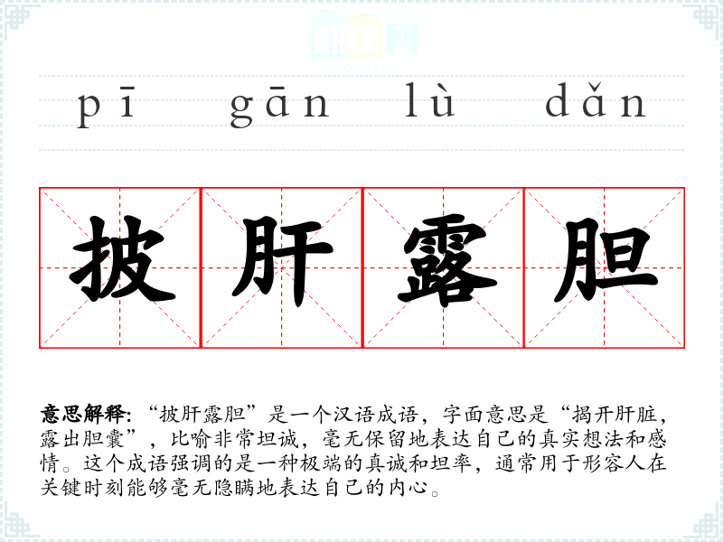 “披肝露胆”是一个汉语成语,字面意思是“揭开肝脏,露出胆囊”,比喻非常坦诚,毫无保留地表达自己的真实想法和感情。这个成语强调的是一种极端的真诚和坦率,通常用于形容人在关键时刻能够毫无隐瞒地表达自己的内心。