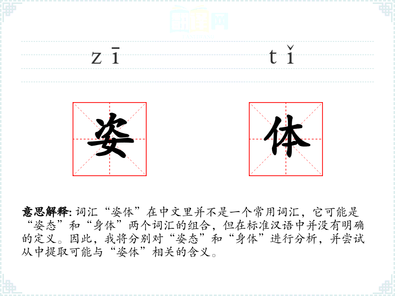 词汇“姿体”在中文里并不是一个常用词汇,它可能是“姿态”和“身体”两个词汇的组合,但在标准汉语中并没有明确的定义。因此,我将分别对“姿态”和“身体”进行分析,并尝试从中提取可能与“姿体”相关的含义。