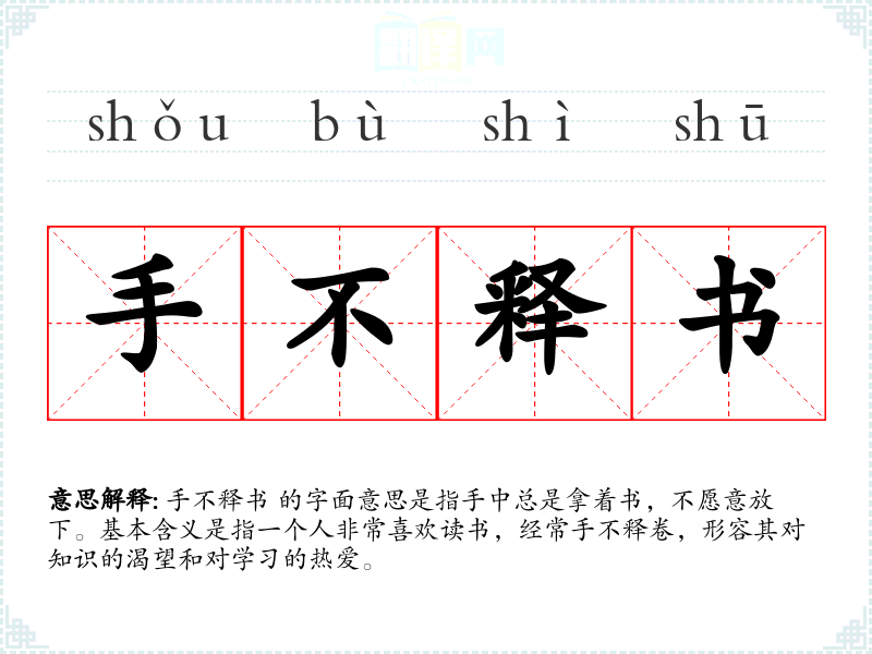 “手不释书”给人以勤奋、专注和热爱学*的正面情感反应。它让我联想到那些在图书馆或书房中埋头苦读的身影,以及他们对知识的渴望和对未来的憧憬。
