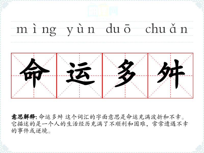 命运多舛 这个词汇的字面意思是命运充满波折和不幸。它描述的是一个人的生活经历充满了不顺利和困难,常常遭遇不幸的**或逆境。