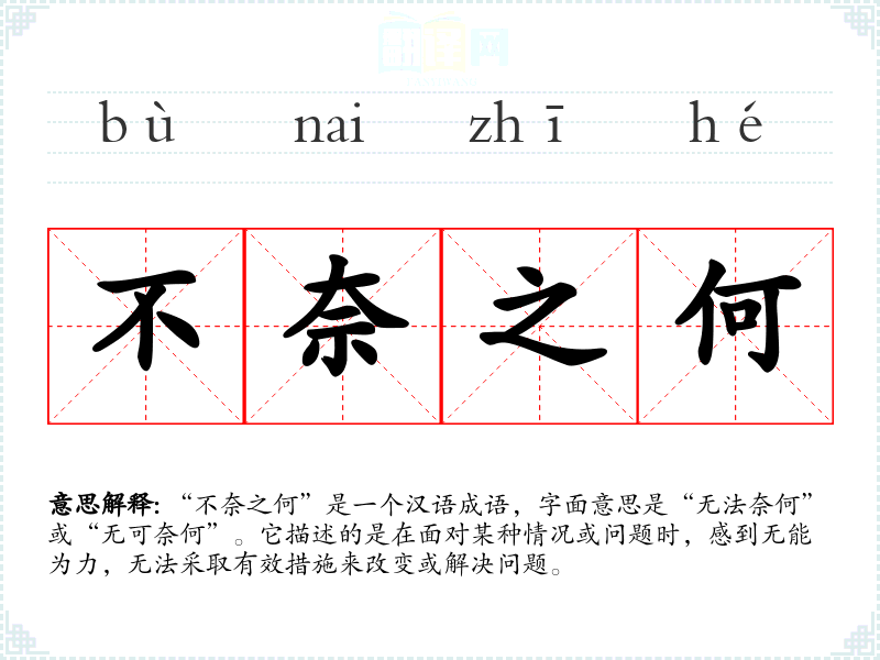 “不奈之何”是一个汉语成语,字面意思是“无法奈何”或“无可奈何”。它描述的是在面对某种情况或问题时,感到无能为力,无法采取有效措施来改变或解决问题。