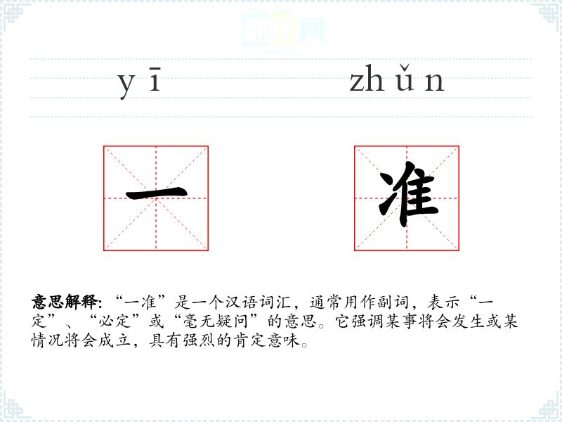 “一准”的词源较为直接,由“一”和“准”组成。在古代汉语中,“准”有“标准”、“准则”的意思,而“一”表示“唯一”或“一致”。随着语言的发展,“一准”逐渐演变为表示确定性的副词。