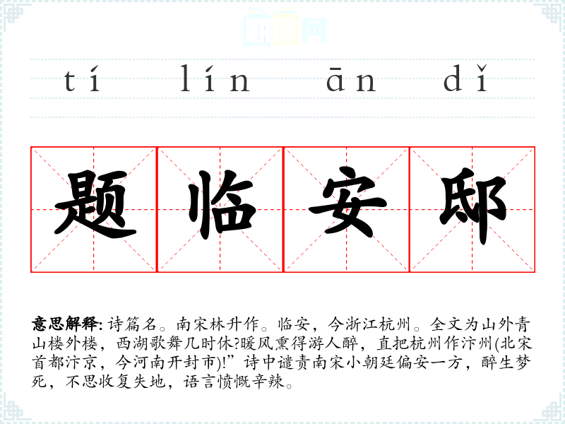 1.诗篇名。南宋林升作。临安,今浙江杭州。全文为山外青山楼外楼,西湖歌舞几时休?暖风熏得游人醉,直把杭州作汴州(北宋首都汴京,今河南开封市)!”诗中谴责南宋小朝廷偏安一方,醉生梦死,不思收复失地,语言愤慨辛辣。