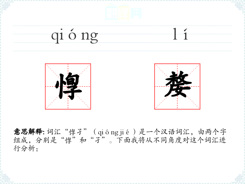 词汇“惸孑”(qióng jié)是一个汉语词汇,由两个字组成,分别是“惸”和“孑”。下面我将从不同角度对这个词汇进行分析: