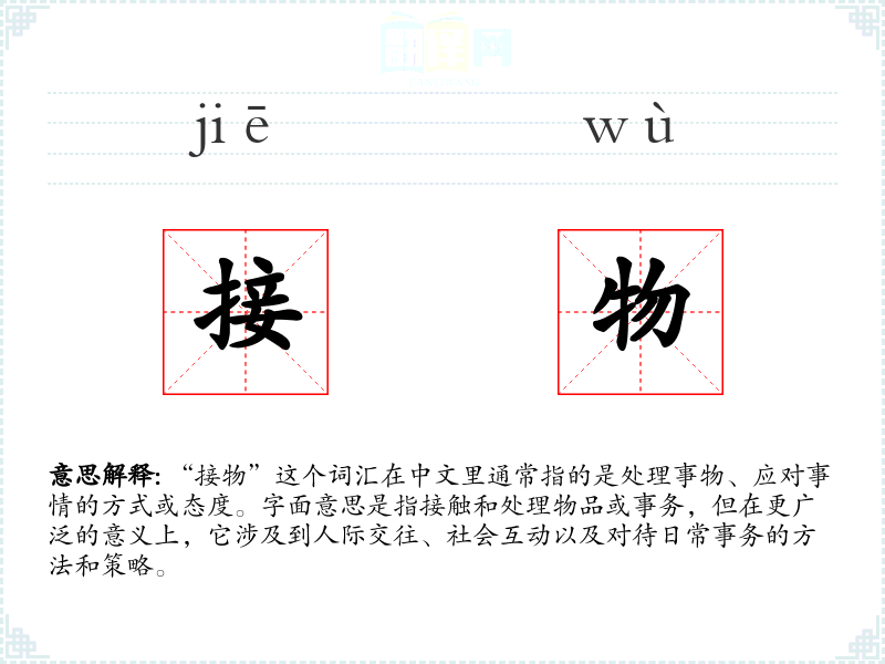 “接物”这个词汇在中文里通常指的是处理事物、应对事情的方式或态度。字面意思是指接触和处理物品或事务,但在更广泛的意义上,它涉及到人际交往、社会互动以及对待日常事务的方法和策略。