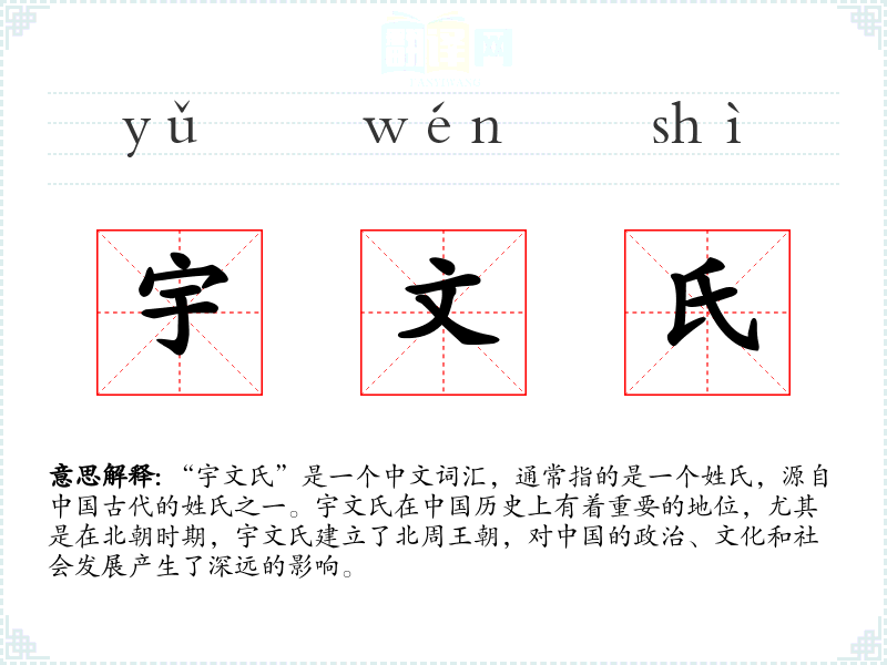“宇文氏”的词源可以追溯到古代的鲜卑族,宇文氏原本是鲜卑族的一个部落名称,后来逐渐演变为姓氏。在北朝时期,宇文氏通过政治联姻和军事征服,逐渐壮大并最终建立了北周王朝。