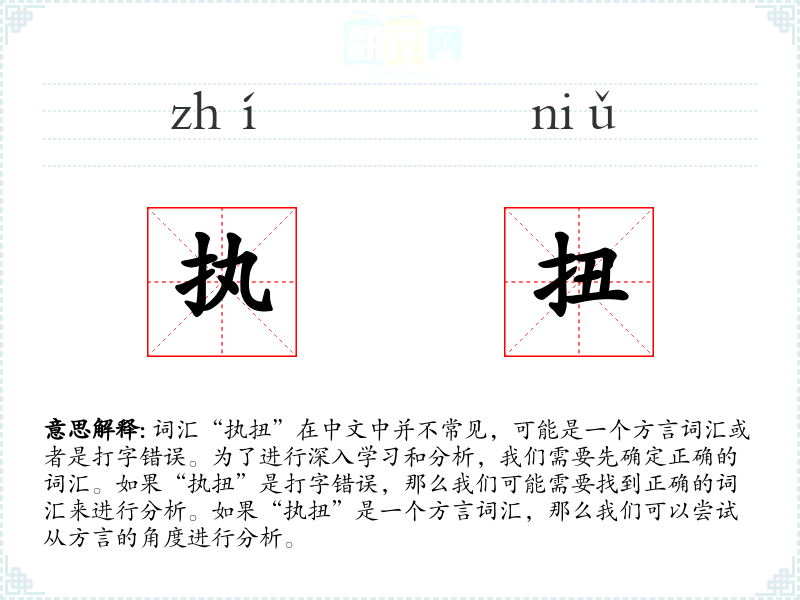 词汇“执扭”在中文中并不常见,可能是一个方言词汇或者是打字错误。为了进行深入学习和分析,我们需要先确定正确的词汇。如果“执扭”是打字错误,那么我们可能需要找到正确的词汇来进行分析。如果“执扭”是一个方言词汇,那么我们可以尝试从方言的角度进行分析。