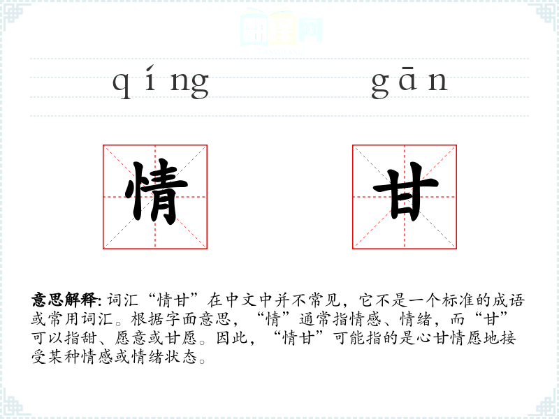 由于“情甘”不是一个常用词汇,它在不同语境下的使用非常有限。可能在一些文学作品或特定语境中出现,用以表达某人对某种情感或决定的自愿接受。
