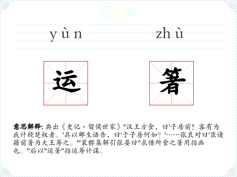 1.典出《史记·留侯世家》"汉王方食,曰'子房前!客有为我计桡楚权者。'具以郦生语告,曰'于子房何如?'……张良对曰'臣请藉前箸为大王筹之。'"裴髎集解引张晏曰"求借所食之箸用指画也。"后以"运箸"指运筹计谋。
