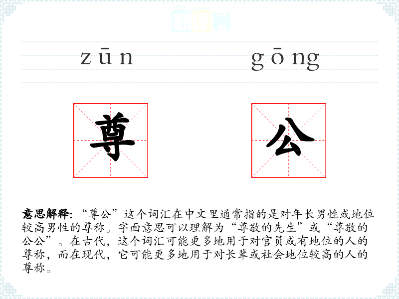 “尊公”这个词汇在中文里通常指的是对年长男性或地位较高男性的尊称。字面意思可以理解为“尊敬的先生”或“尊敬的公公”。在古代,这个词汇可能更多地用于对官员或有地位的人的尊称,而在现代,它可能更多地用于对长辈或社会地位较高的人的尊称。