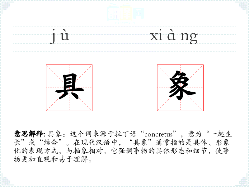 具象:这个词来源于拉丁语“concretus”,意为“一起生长”或“结合”。在现代汉语中,“具象”通常指的是具体、形象化的表现方式,与抽象相对。它强调事物的具体形态和细节,使事物更加直观和易于理解。