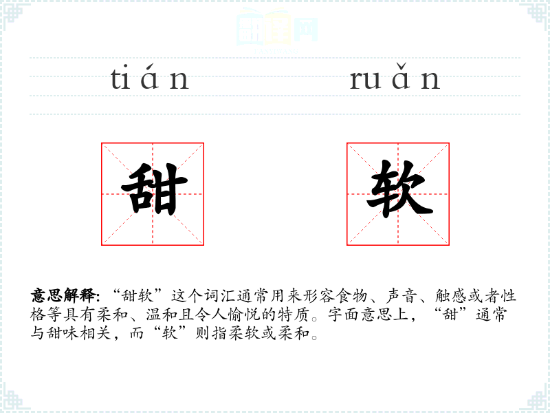 “甜”字源自古代汉语,最初指甜味,后来扩展到形容其他令人愉悦的事物。“软”字同样源自古代汉语,最初指物体的柔软性,后来也用于形容性格或声音的柔和。