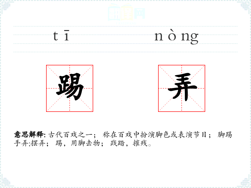 古代百戏之一; 称在百戏中扮演脚色或表演节目; 脚踢手弄;摆弄; 踢,用脚击物; 践踏,摧残。