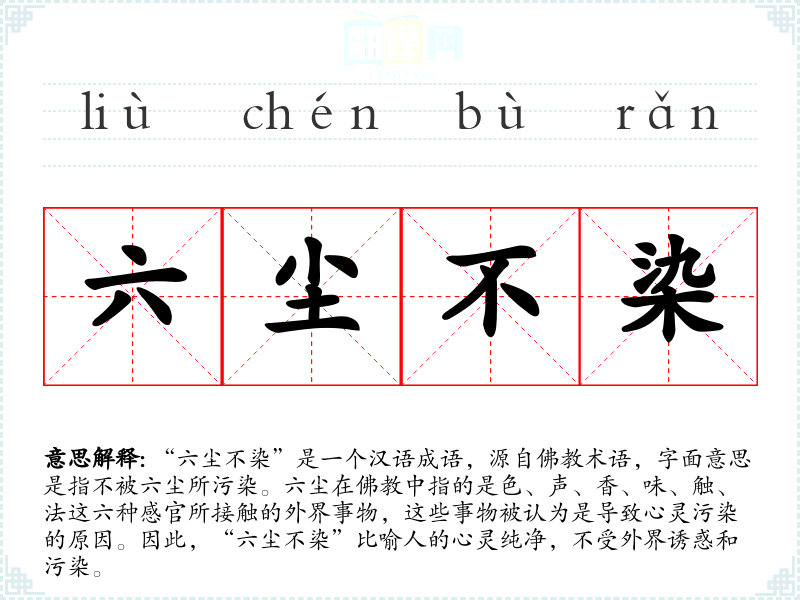 “六尘不染”是一个汉语成语,源自术语,字面意思是指不被六尘所污染。六尘在中指的是色、声、香、味、触、法这六种感官所接触的外界事物,这些事物被认为是导致心灵污染的原因。因此,“六尘不染”比喻人的心灵纯净,不受外界诱惑和污染。