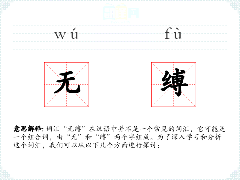 词汇“无缚”在汉语中并不是一个常见的词汇,它可能是一个组合词,由“无”和“缚”两个字组成。为了深入学习和分析这个词汇,我们可以从以下几个方面进行探讨: