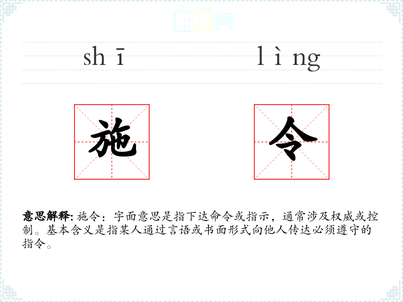 施令:字面意思是指下达命令或指示,通常涉及权威或控制。基本含义是指某人通过言语或书面形式向他人传达必须遵守的指令。