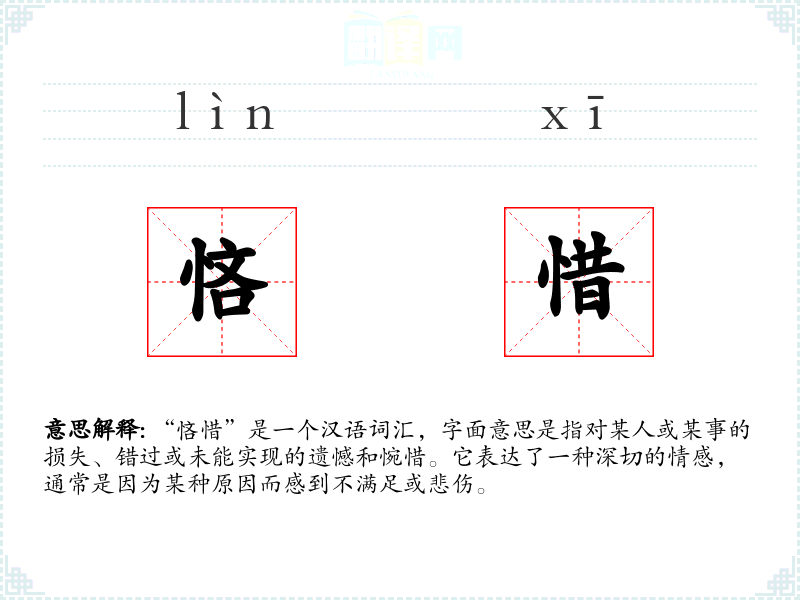 “悋惜”是一个汉语词汇,字面意思是指对某人或某事的损失、错过或未能实现的遗憾和惋惜。它表达了一种深切的情感,通常是因为某种原因而感到不满足或悲伤。