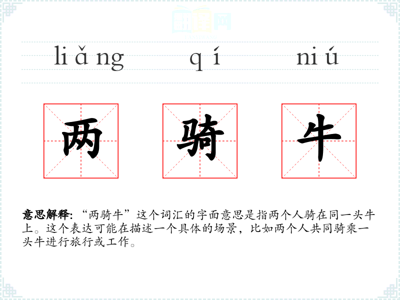 “两骑牛”这个词汇的字面意思是指两个人骑在同一头牛上。这个表达可能在描述一个具体的场景,比如两个人共同骑乘一头牛进行旅行或工作。