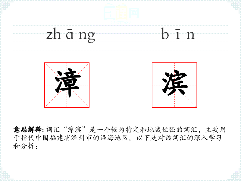 - 口语语境:在日常口语中,当地居民可能会用“漳滨”来指代自己居住的沿海区域,或者描述与漳州沿海相关的事物。